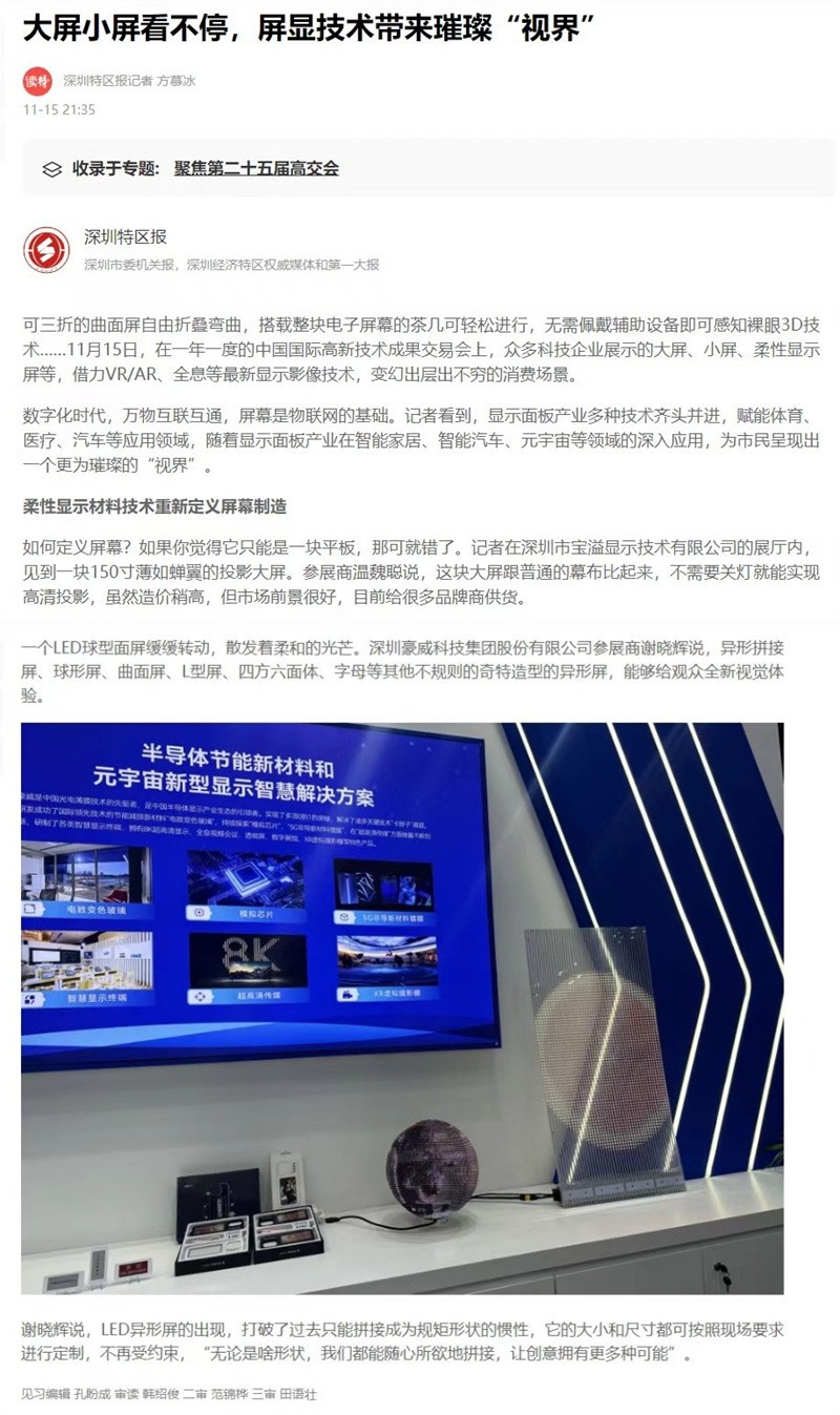展会上,我们接受了深圳特区报记者来的采访,并对我们的新型显示产品进行了同期报道。